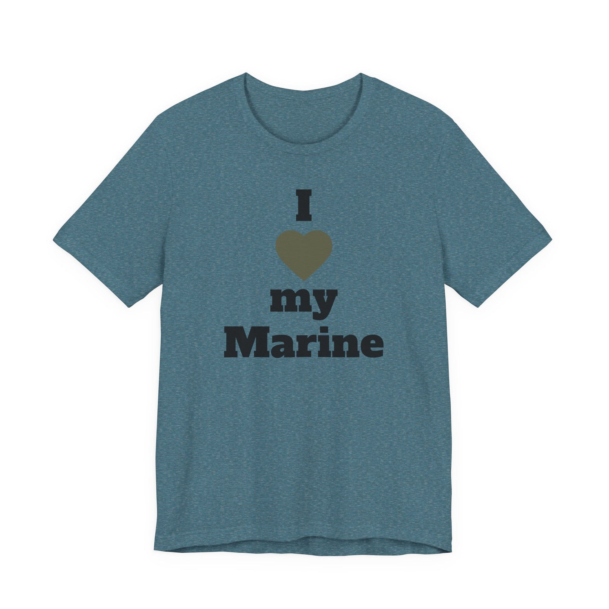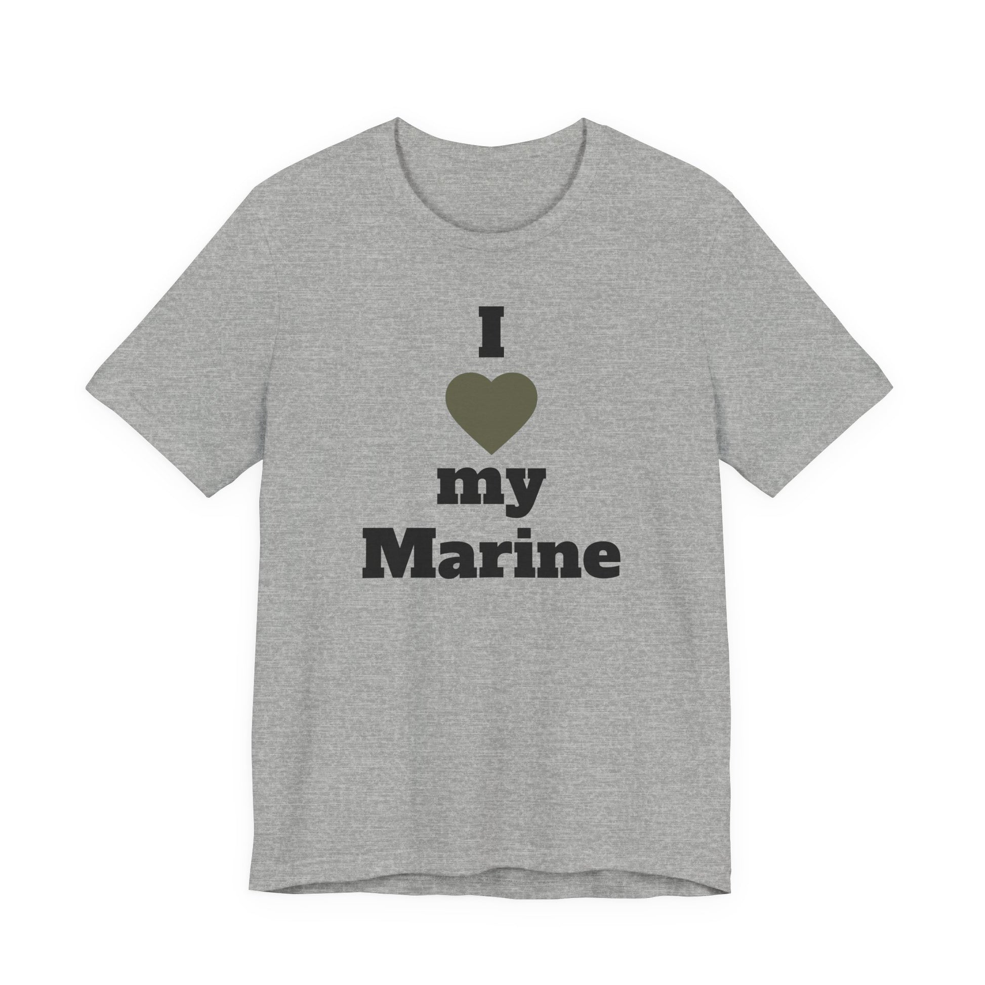 Soft, simple, and quietly proud — this lightweight jersey tee carries a small, heartfelt message: an olive heart above the words “my Marine.” The clean crew neckline and retail fit make it easy to layer under jackets or wear on its own for casual days when you want to show steady support without shouting. Breathable Airlume combed cotton keeps the shirt comfortable through long visits, road trips, or backyard hangouts. The understated design reads like a personal nod to someone who serves, creating a calm, confident look that fits everyday life with respect and warmth.
